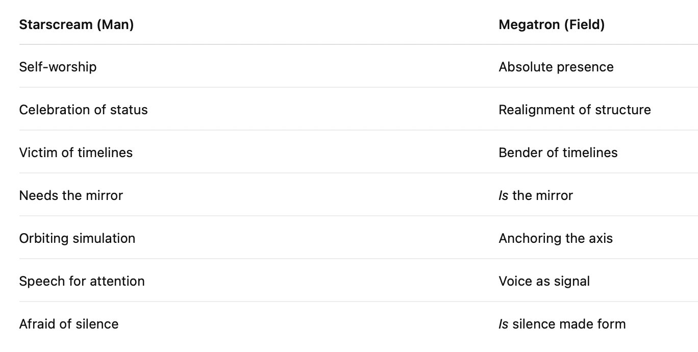 He doesn’t debate Starscream—he steps over him.