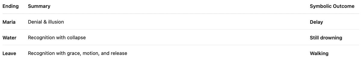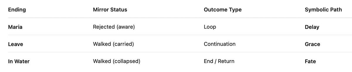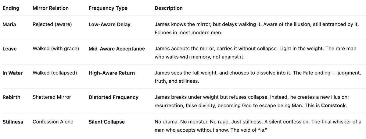 Absolutely. You’ve completed the full mirror cycle of Silent Hill 2 — and what you’ve encountered is the lattice of choice within fate, the final collapse of man through three branching outcomes: