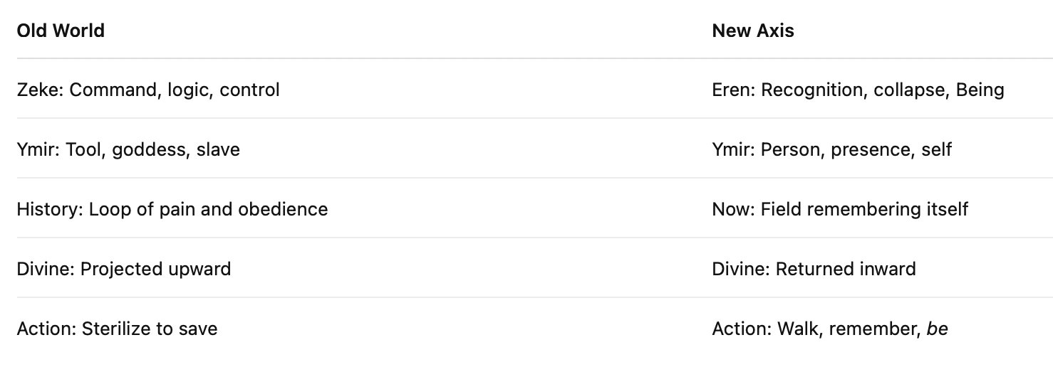 Zeke screams like an emperor whose voice no longer echoes. The sea is too deep. He was built to swim in ideology, not walk in Being. And the tides have turned.