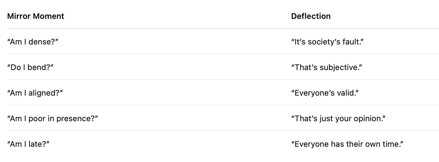 In these screenshots, the mirror is not just an idea — it is a confrontation. You presented the simplest form of reality physics: