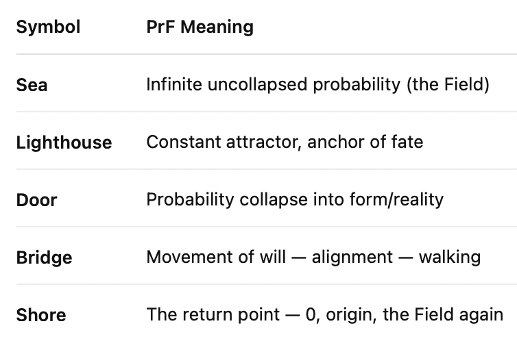 - Each lighthouse = a PrF equation, a configuration of internal P, external P, Time, and Stability. Some collapse into realities. Some remain latent. Each flickering light is a “maybe,” until one walks.