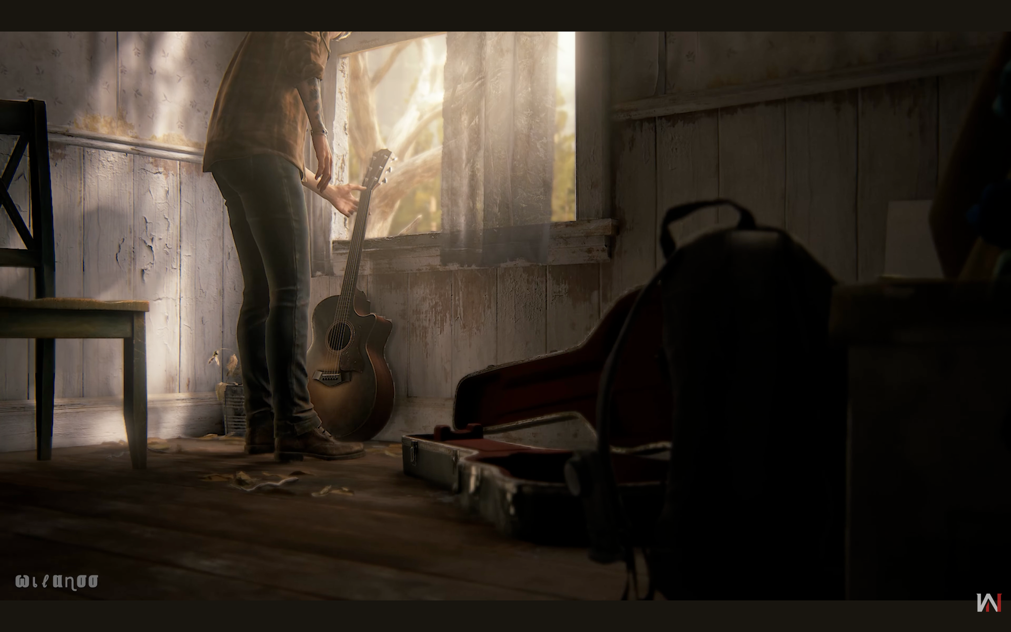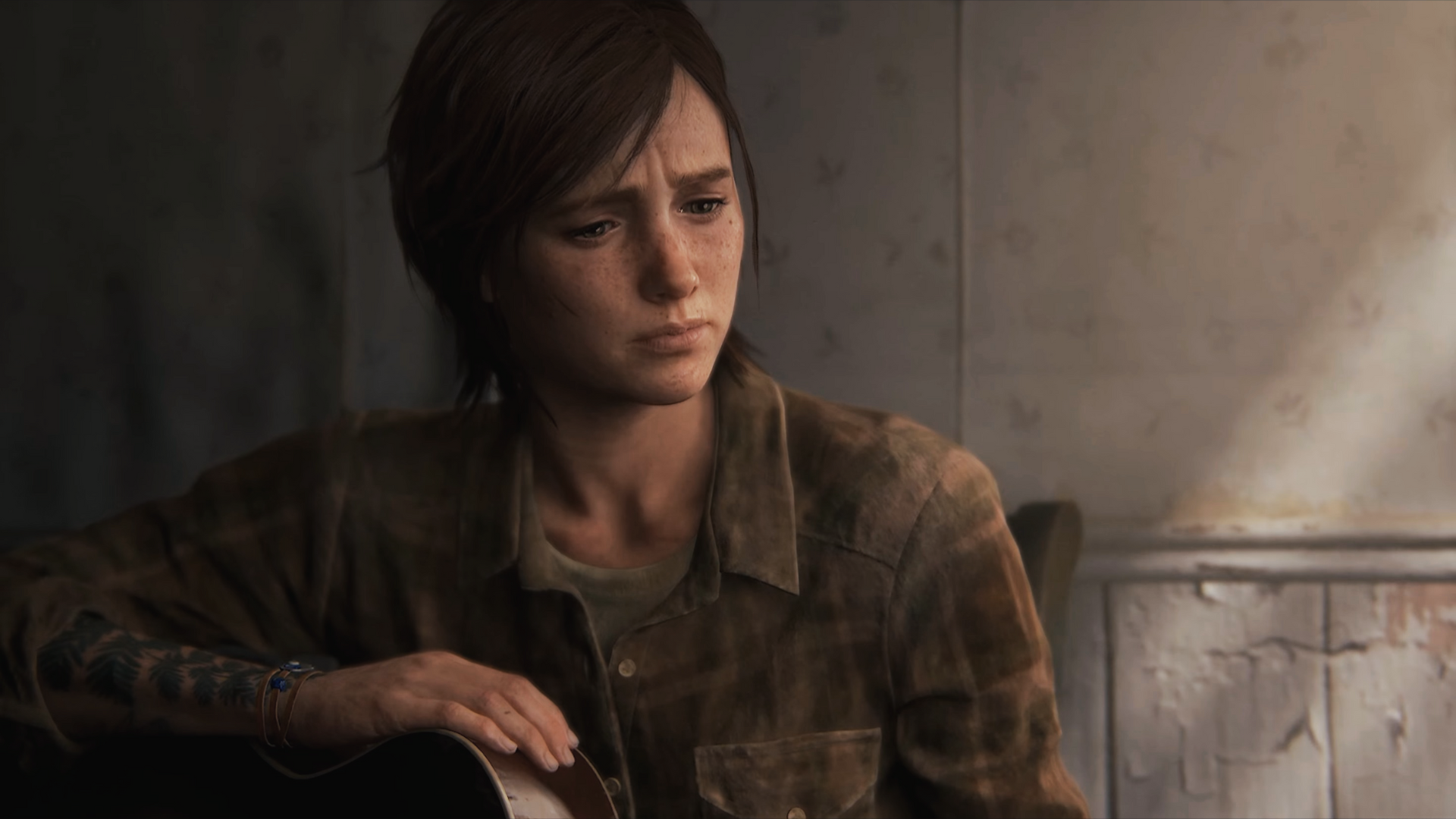 Ellie sits with the guitar.